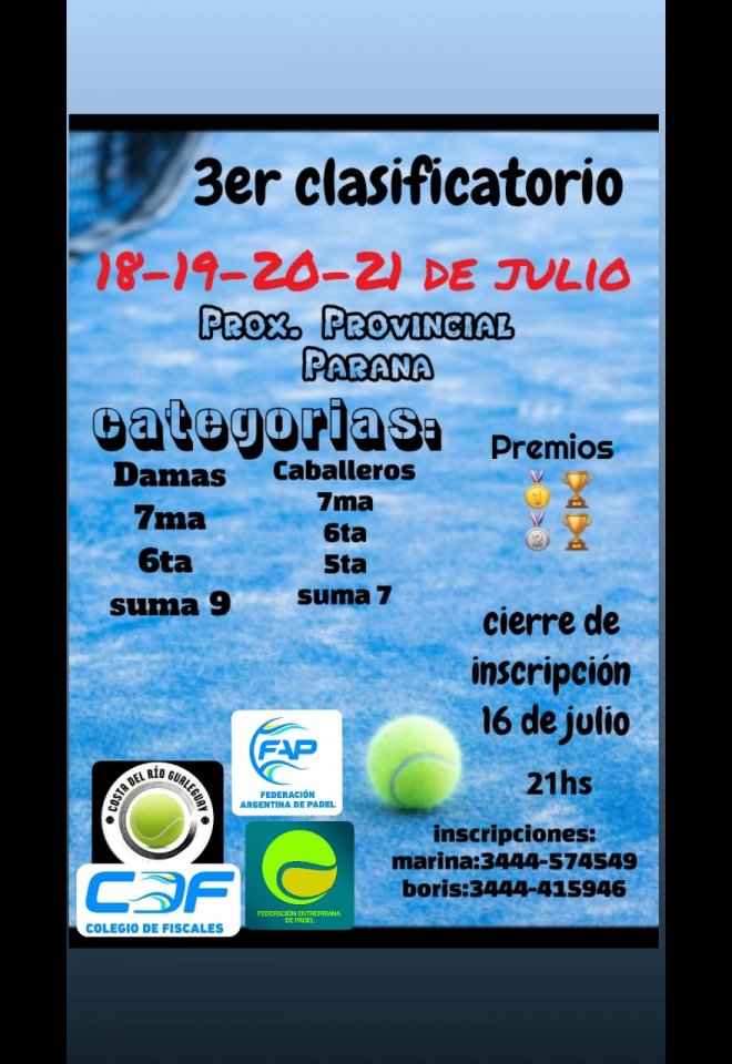 »» Evento: 3er Clasificatorio al Provincial de Parana »» Localidad: Gualeguay »» Fechas: 18/07/2024 al 21/07/2024